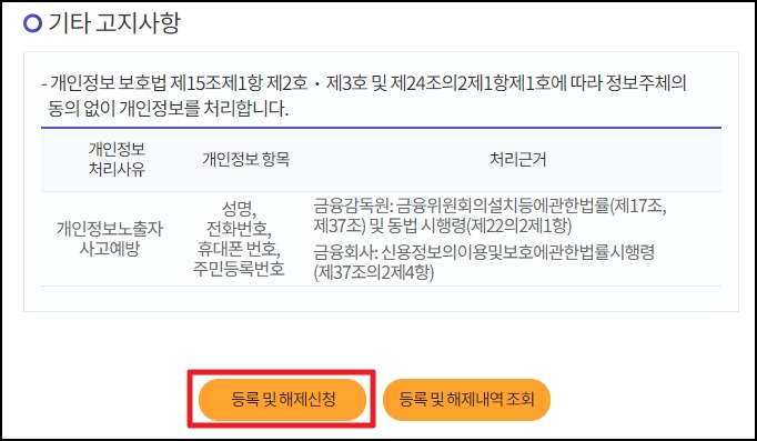 해당 사이트에 접속하여 등록 및 해제 신청을 클릭합니다.