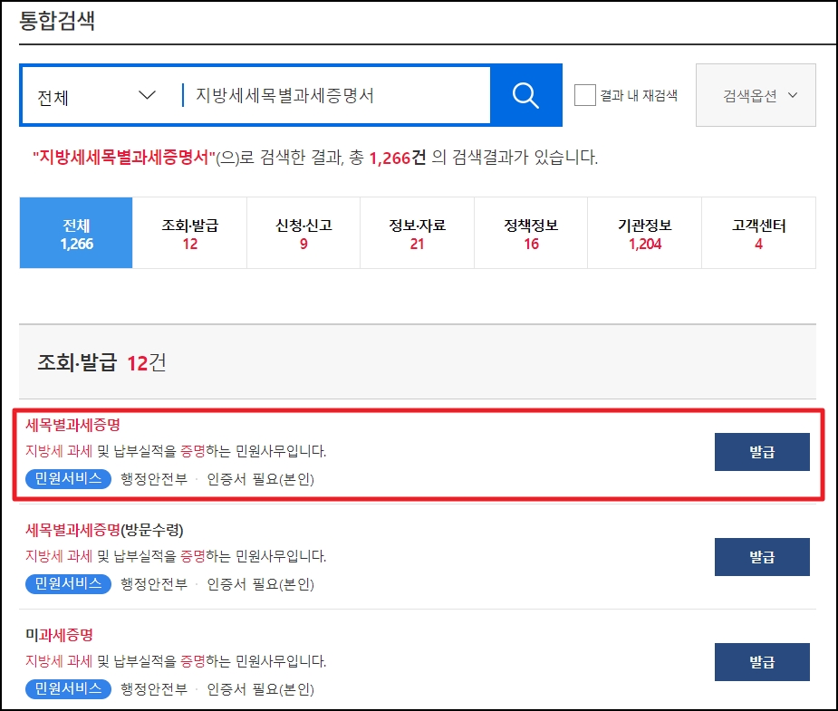 2. 통합검색에서 지방세 세목별과세증명서를 검색합니다.