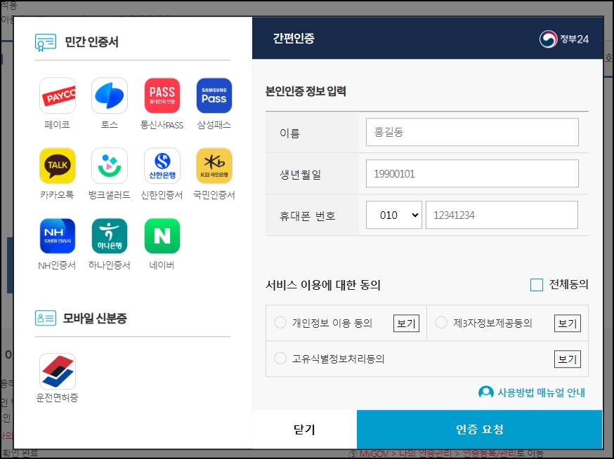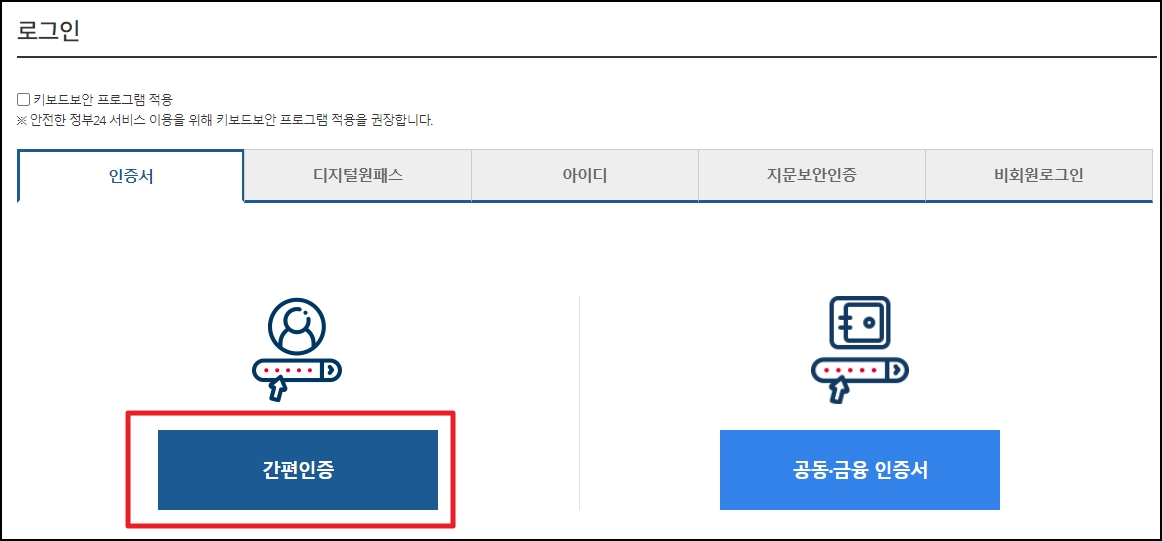 간편인증을 통해서 손십게 로그인 하시면 되겠습니다.