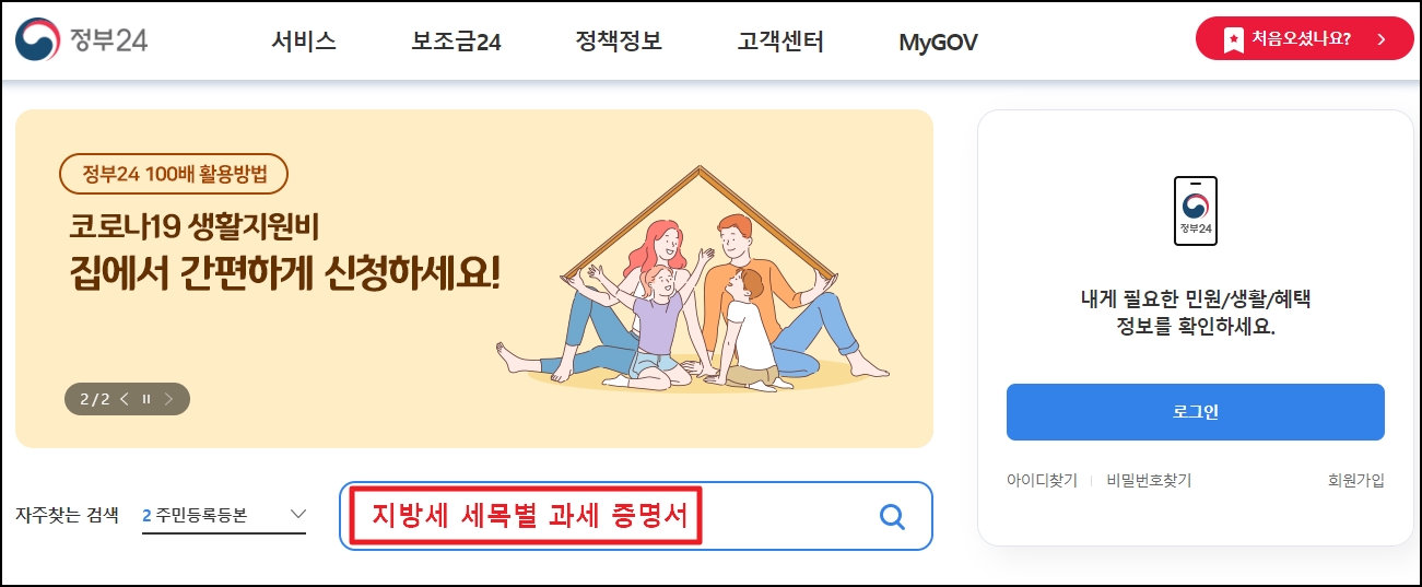 정부 24 사이트 중간에 있는 통합검색에서 지방세 세목별 과세증명서를 입력합니다.